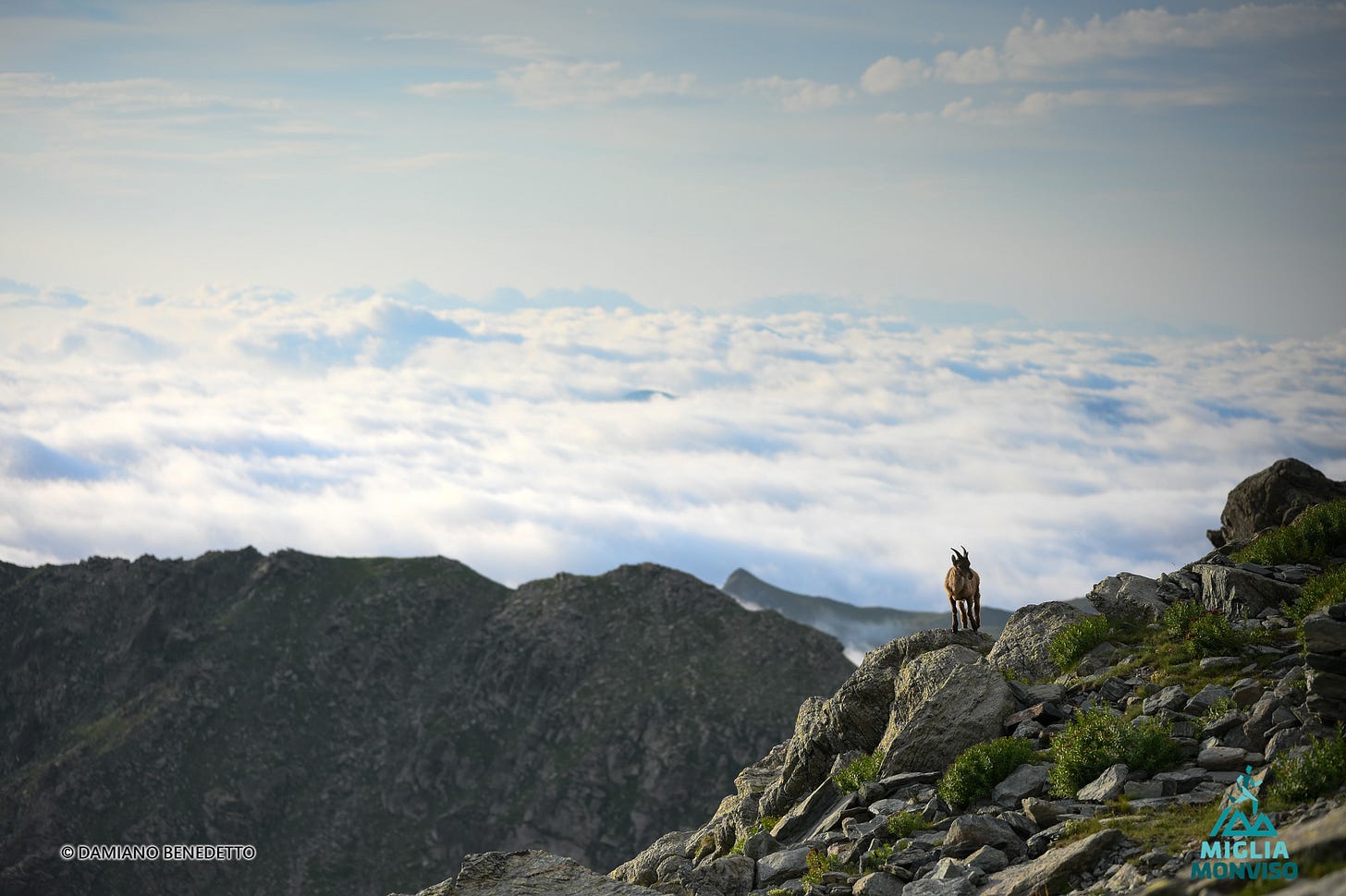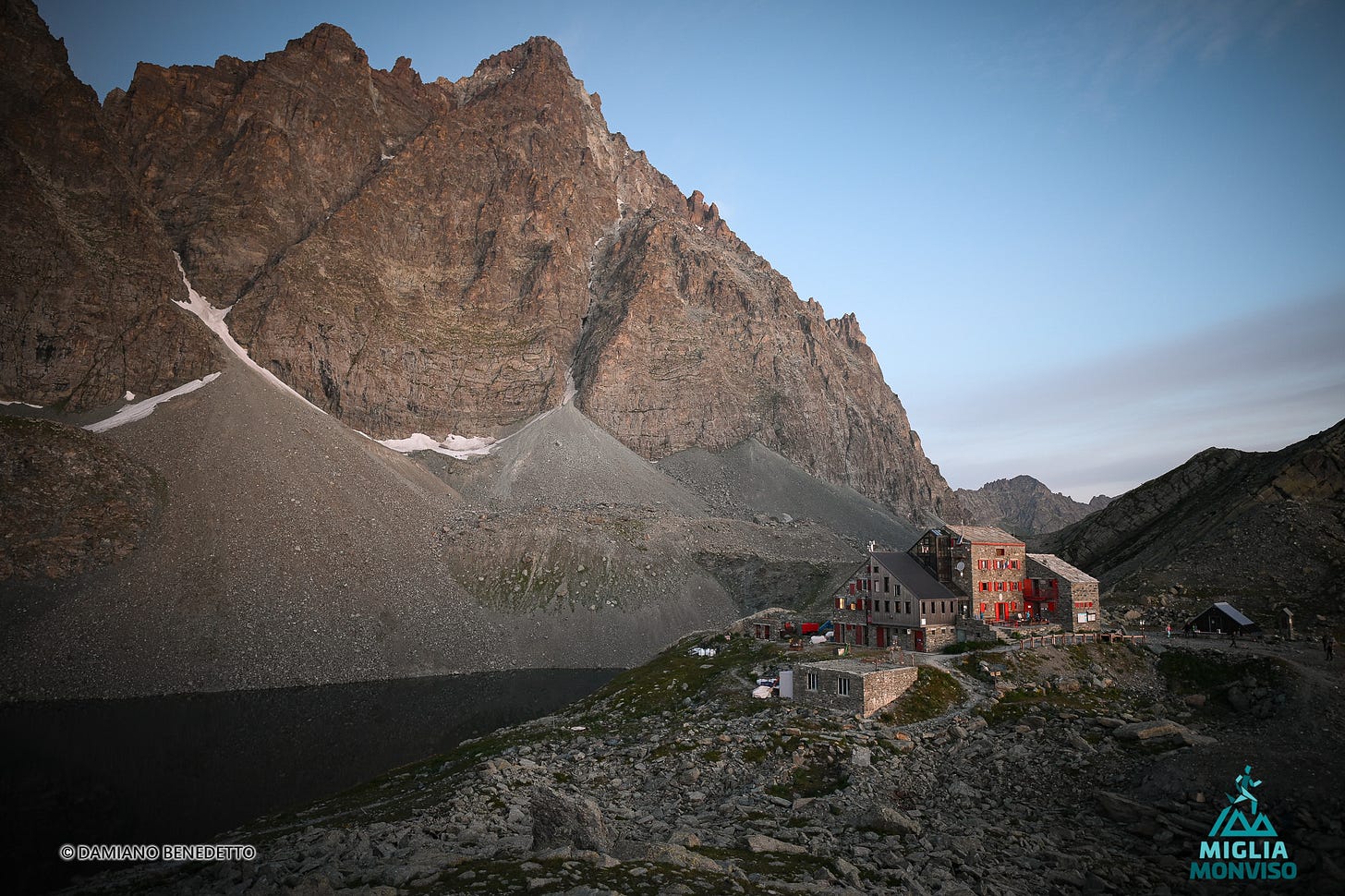 I cover the entire ascent alongside Mattia, bib number 5, a guy from Bergamo, also new to this distance. As we climb, we leave the clouds behind, and in front of us unfolds the majestic spectacle of Monviso, surrounded by its crown of jagged peaks. The sun paints the rock in shades of pink as it rises above the green meadows and the blue sky. Paradise.